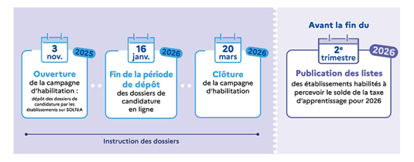 • Ouverture de la campagne d’habilitation : dépôt des dossiers par les établissements sur SOLTéA à partir du 3 novembre 2025.